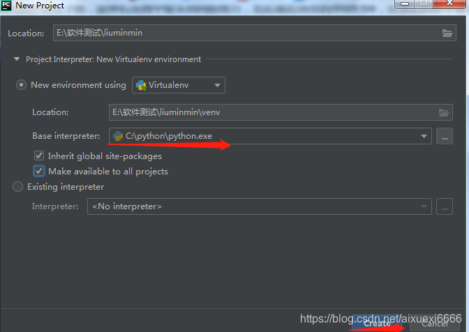 5、点击Create New Project,进入如下图的界面,图中的Location是选择你安装的python的位置,选择好后,点击create。