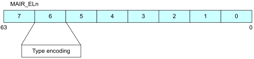 The memory type is not directly encoded in the translation table entry. (内存类型不是在翻译表格入口直接编码) Instead, each block entry specifies a 3-bit index into a table of memory types. (取而代之的是, 每个块入口指定一个3-bit索引的内存类型表格)This table is stored in the Memory Attribute Indirection Register MAIR_ELn.(这个表格存储在内存属性间接寄存器 MAIR_ELn 中) This table has eight entries and each of those entries has eight bits, as shown in Figure 13-1. (这个表格有8个入口, 每个入口有8个bit)