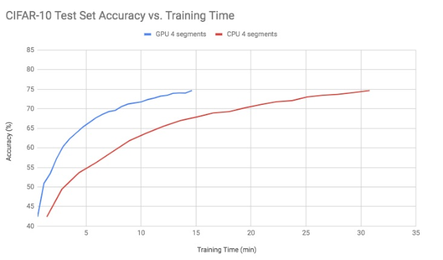 现代的GPU具有高内存带宽而且每个芯片的处理单元数量是CPU的200倍,这是因为它们针对并行数据计算(如矩阵运算)进行了优化。CPU则设计的更为通用以执行更多种类的任务。因此使用GPU训练深度神经网络所带来的性能提升是众所周知的。图2显示了常规CPU Greenplum集群与GPU加速Greenplum集群之间的简单深度CNN [6]的性能提升。在这个测试中,我们使用了一个较小的Greenplum集群(具有4个segment)测试了CIFAR-10数据集的的训练时间,结果如下图所示: