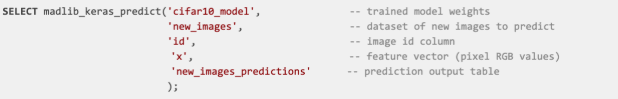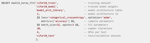 使用MADlib进行程序设计非常简单,只需要在SQL中调用Apache MADlib函数即可。在下面的示例中,我们使用MADlib提供的算法在CIFAR-10 [4]图像数据集上训练模型,具体的SQL如下: