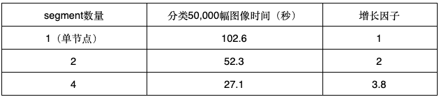 推断(inference)的含义是使用训练模型对新数据进行分类。使用Greenplum这样的MPP数据库非常适合批量处理; 吞吐量随着数据库集群的大小以线性方式增加。例如,使用我们上面训练的CNN模型,表1显示了对50,000个新的32x32RGB图像执行批量推断所需的时间。