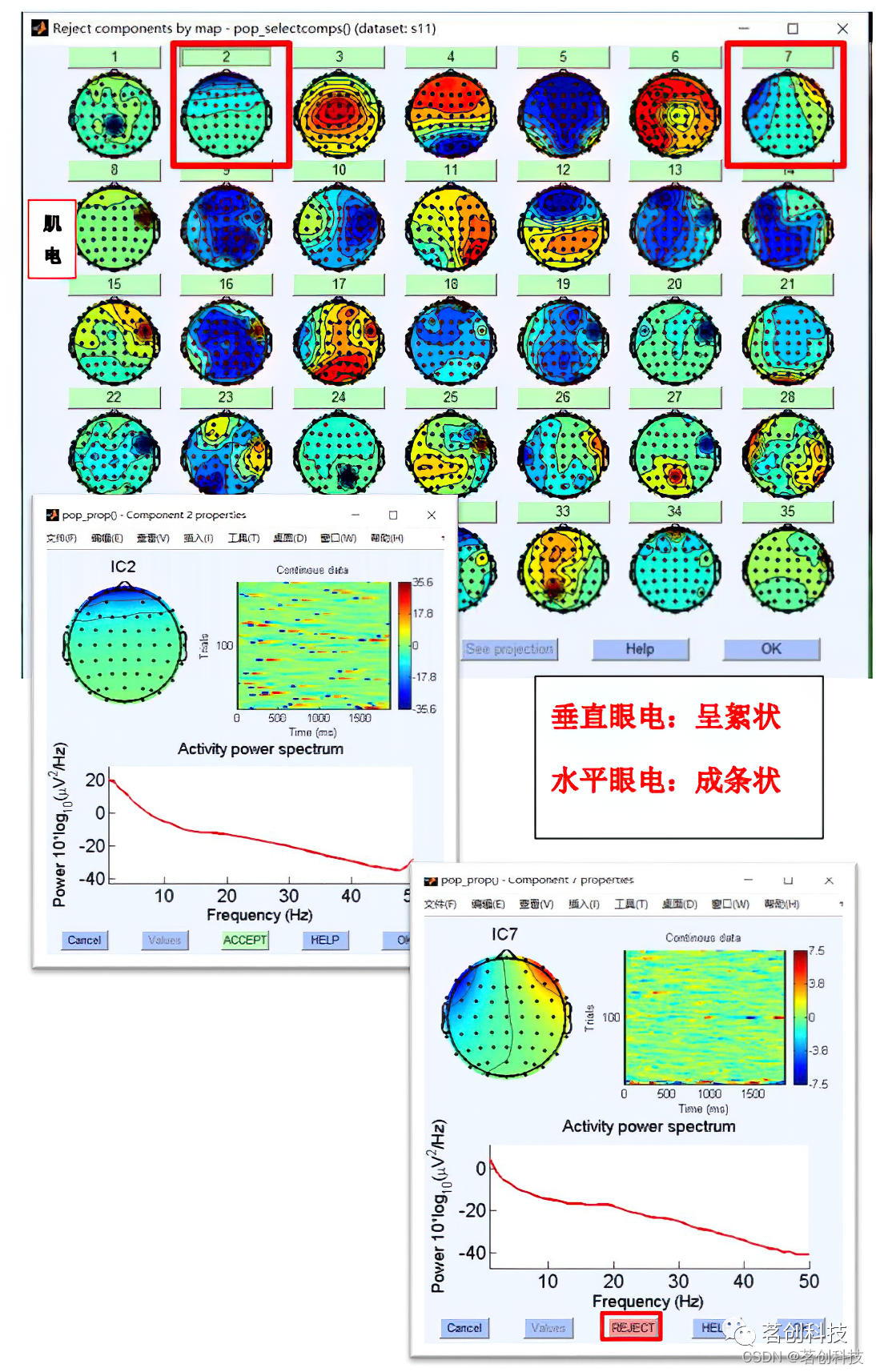 ②把要删除的成分(水平眼电、垂直眼电、肌电等)打开,点击ACCEPT变成REJECT,再点OK。