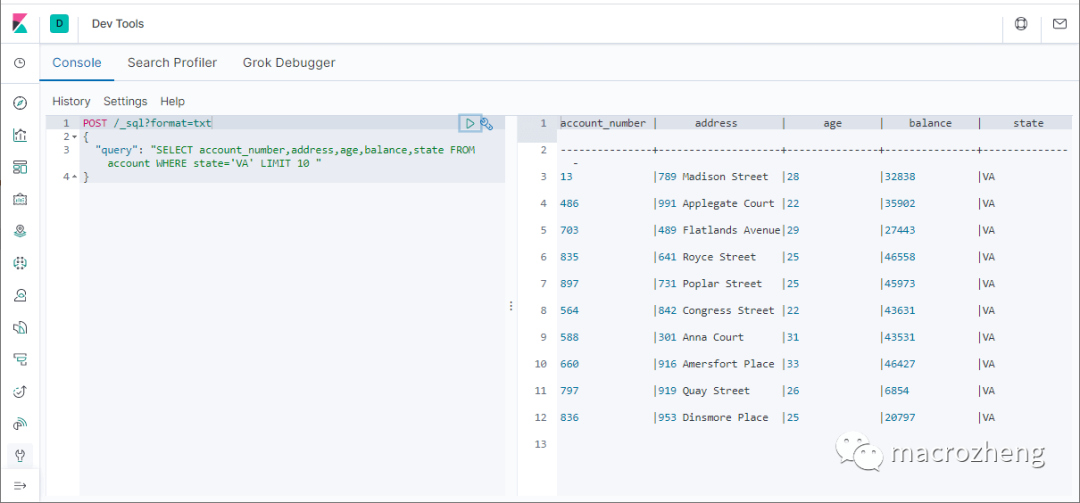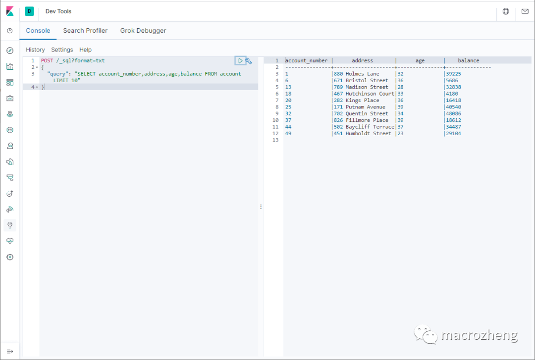 我们使用SQL来查询下前10条记录,可以通过format参数控制返回结果的格式,txt表示文本格式,看起来更直观点,默认为json格式。