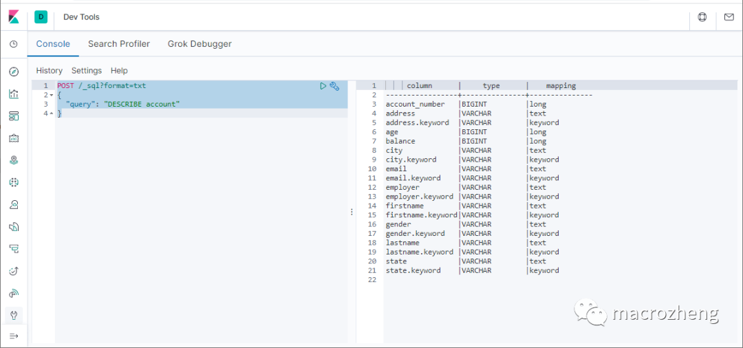 我们可以使用DESCRIBE语句查看表(ES中为索引)中有哪些字段,比如查看account表的字段,查询语句如下。