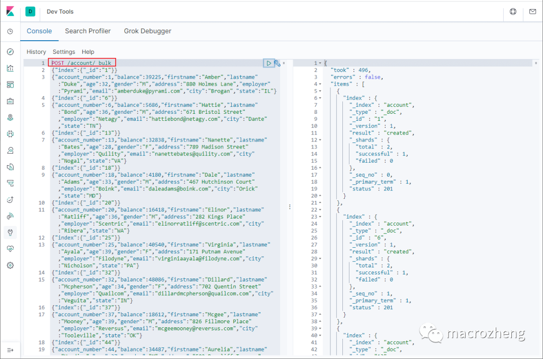 安装完成后在Kibana中导入测试数据,数据地址:https://github.com/macrozheng/mall-learning/blob/master/document/json/accounts.json