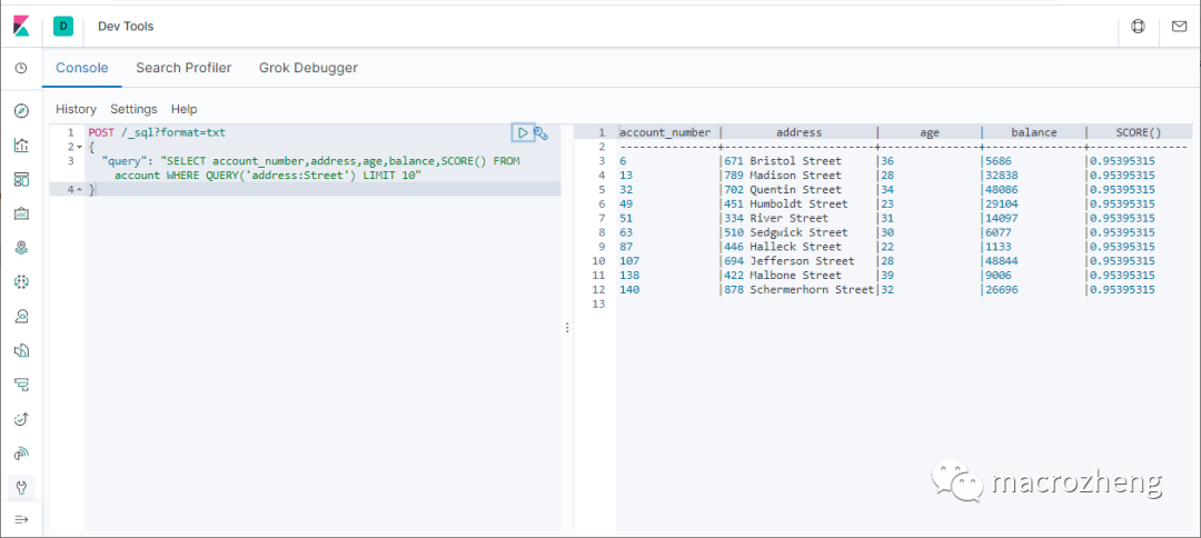 "query": "SELECT account_number,address,age,balance,SCORE() FROM account WHERE MATCH(address,'Street') LIMIT 10"