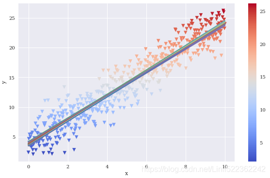 plt.scatter(x,y,c=y, marker='v',cmap='coolwarm')