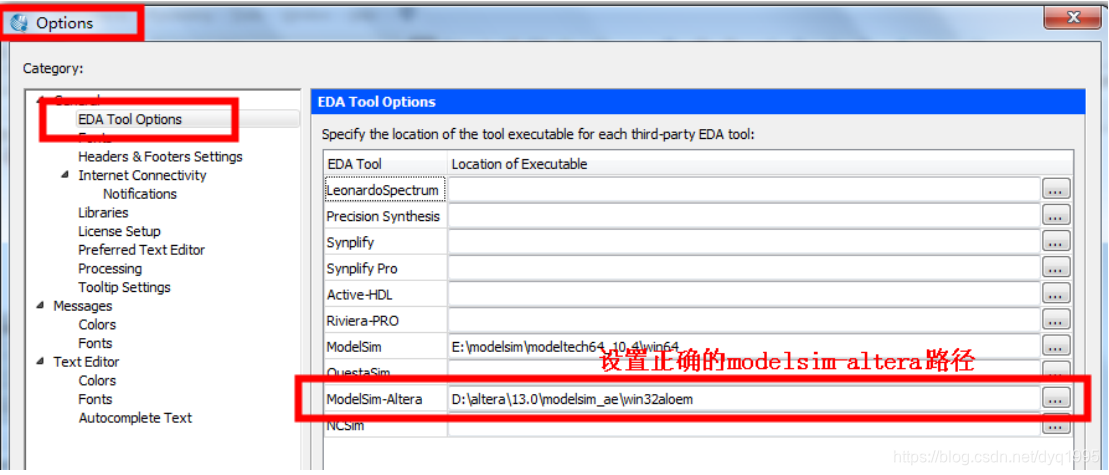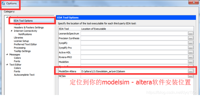 如果你的电脑装的是 modelsim-altera 版本,请按照如下图所示的设置进行工程和工具路径设置: