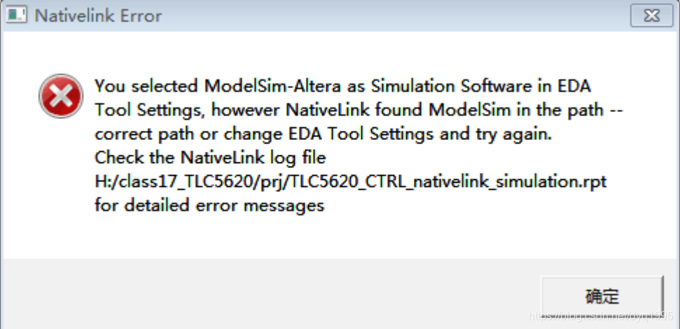 这是由于Quartus II 软件中与 Modelsim 关联设置不对,即 modelsim 路径设置有误。解决方法如下: