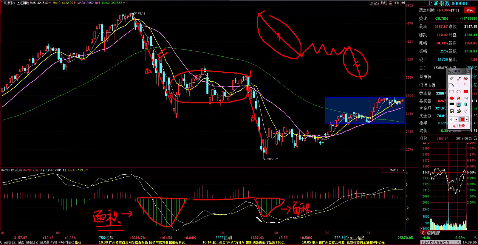 上面描述的红绿柱面积判断方法用于判断本级别的背驰,即围绕本级别中枢的进中枢和出中枢一笔力度的比较;还有很多时候,形成的是次级别中枢,这时通过黄白线高度or红绿柱面积可能未发现背驰迹象,需要通过红绿柱高度来判断是否发生了次级别的内部背驰。