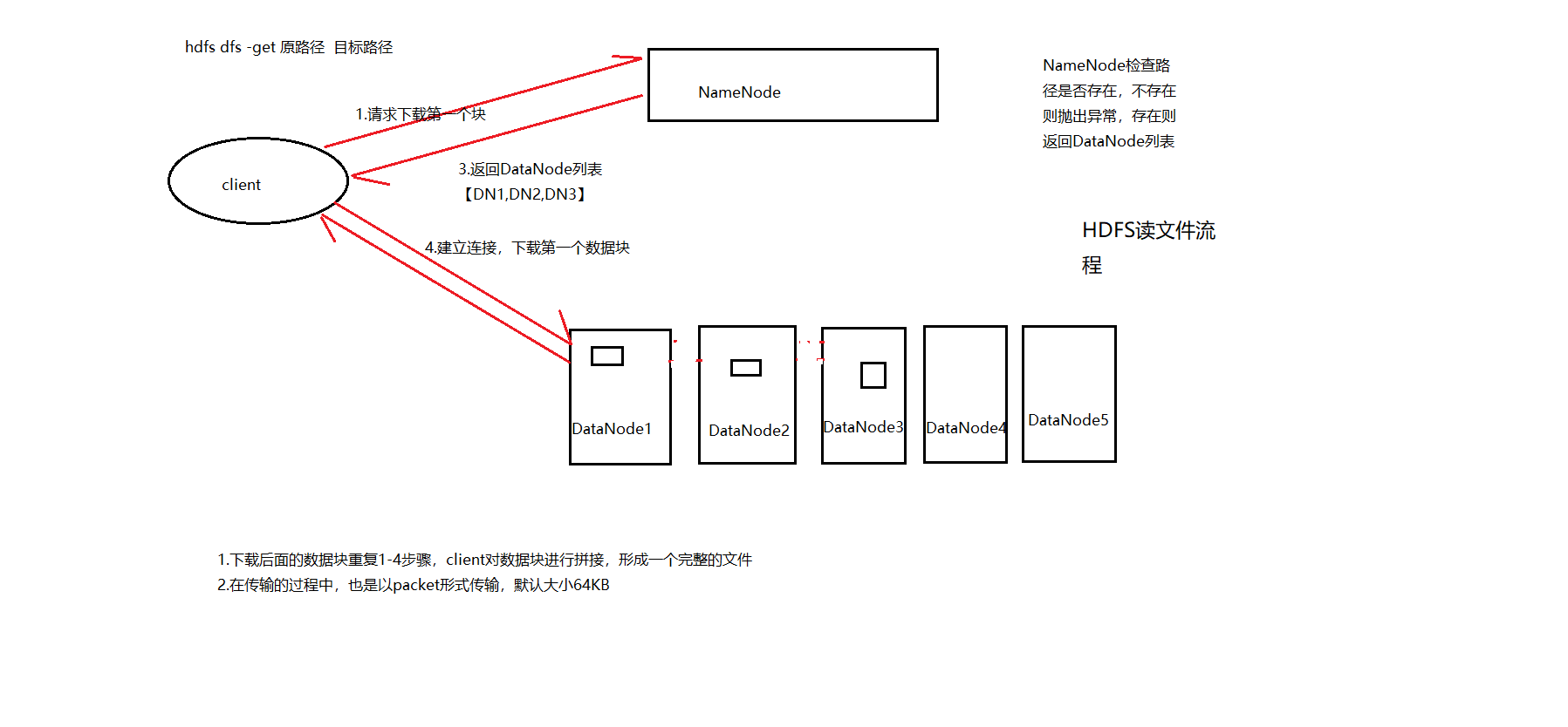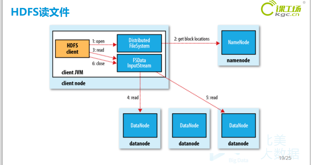 3.获得输入流之后,客户端调用read 方法读取数据。选择最近的DataNode 建立连接并读取数据。