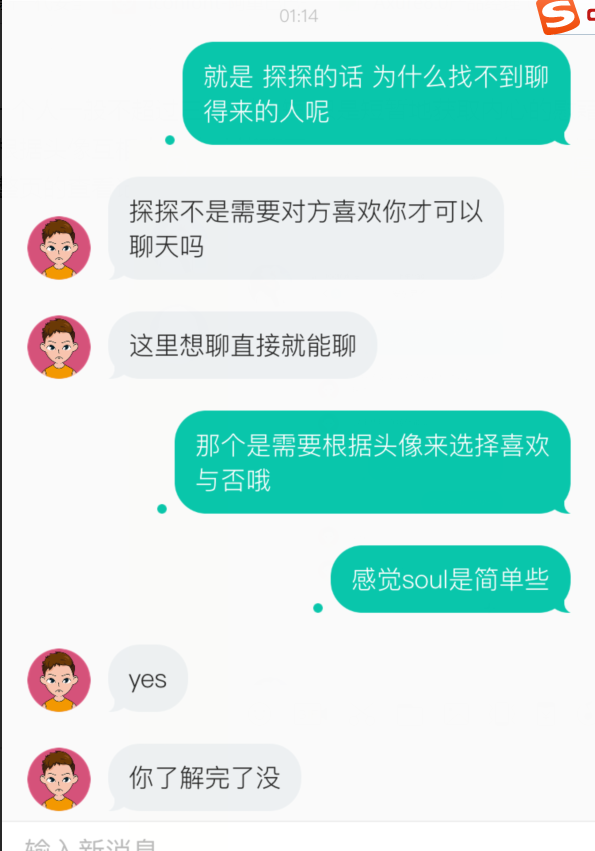 用户反馈:1.soul聊天同一个人一般不超过三天 时间短 只是短暂地获取内心的慰藉。2.相比探探而言,soul用着更简单,容易找到聊天的人,因为探探要根据头像互相点喜欢才能聊天。3.soul聊天记录的用户体验感差,找不到聊天历史记录,只能根据聊天查找找到语句,不能整页整页的查看记录,也不能往上翻聊天内容,我猜这样是不是为了保护个人隐私?