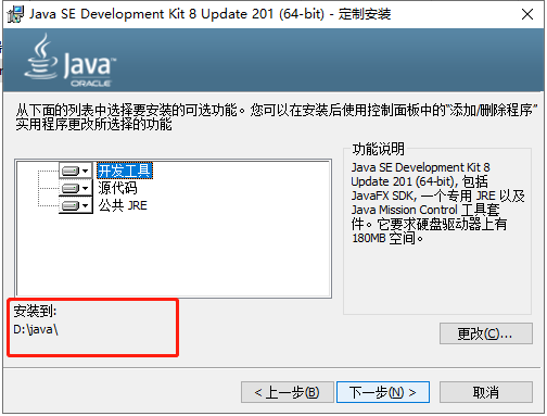 3.点击更改,选择jdk安装路径,为"D:\jdk",点击“下一步”