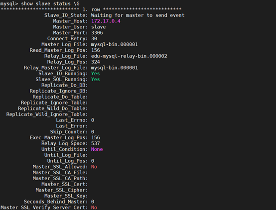 命令:change master to master_host='172.17.0.4', master_user='slave', master_password='123456', master_port=3306, master_log_file='mysql-bin.000001', master_log_pos= 156, master_connect_retry=30;