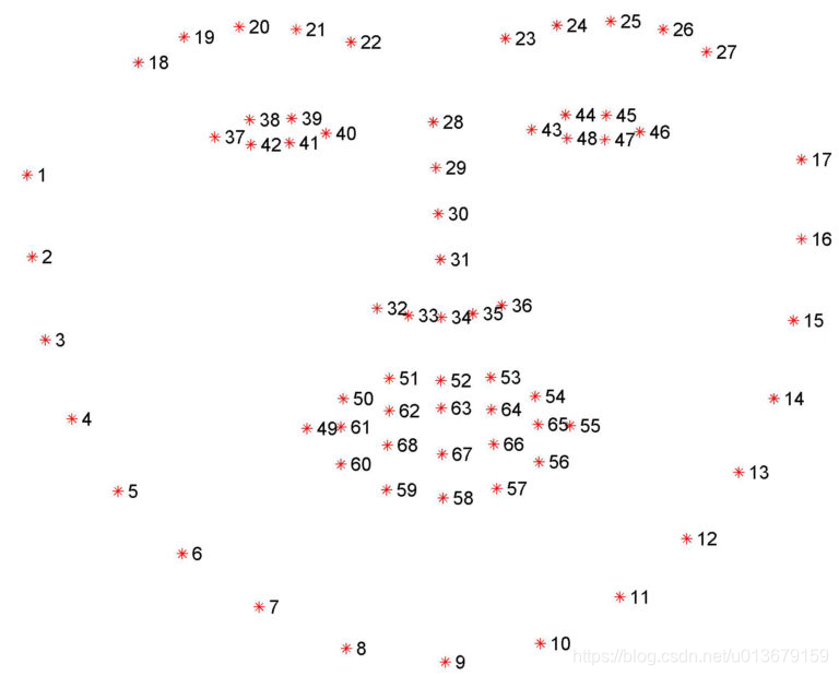 dlib库自带的预训练的人脸特征点检测器用于获取脸部的特定区域对应的68(x,y)个坐标点。69个坐标点的位置如下:
