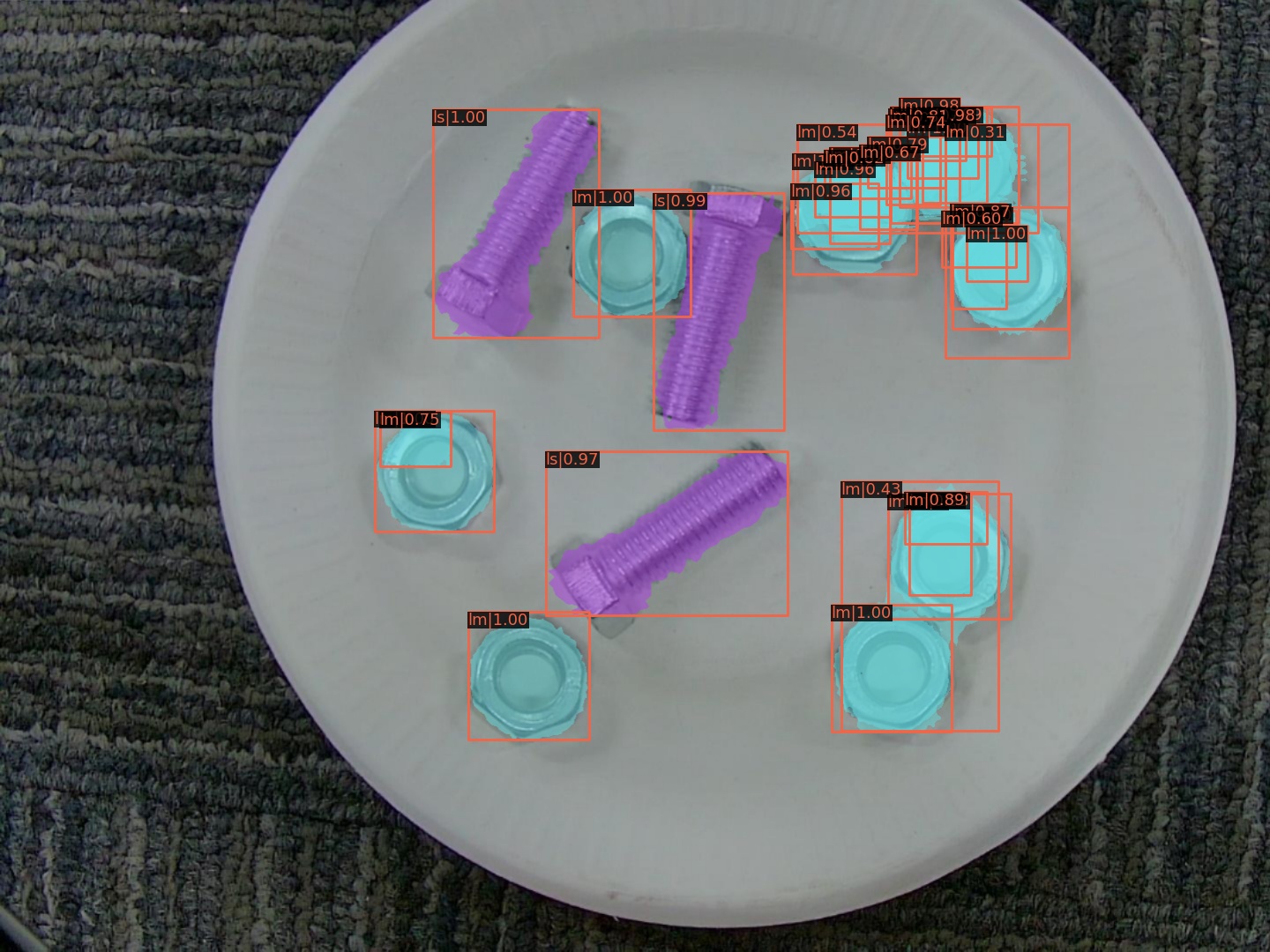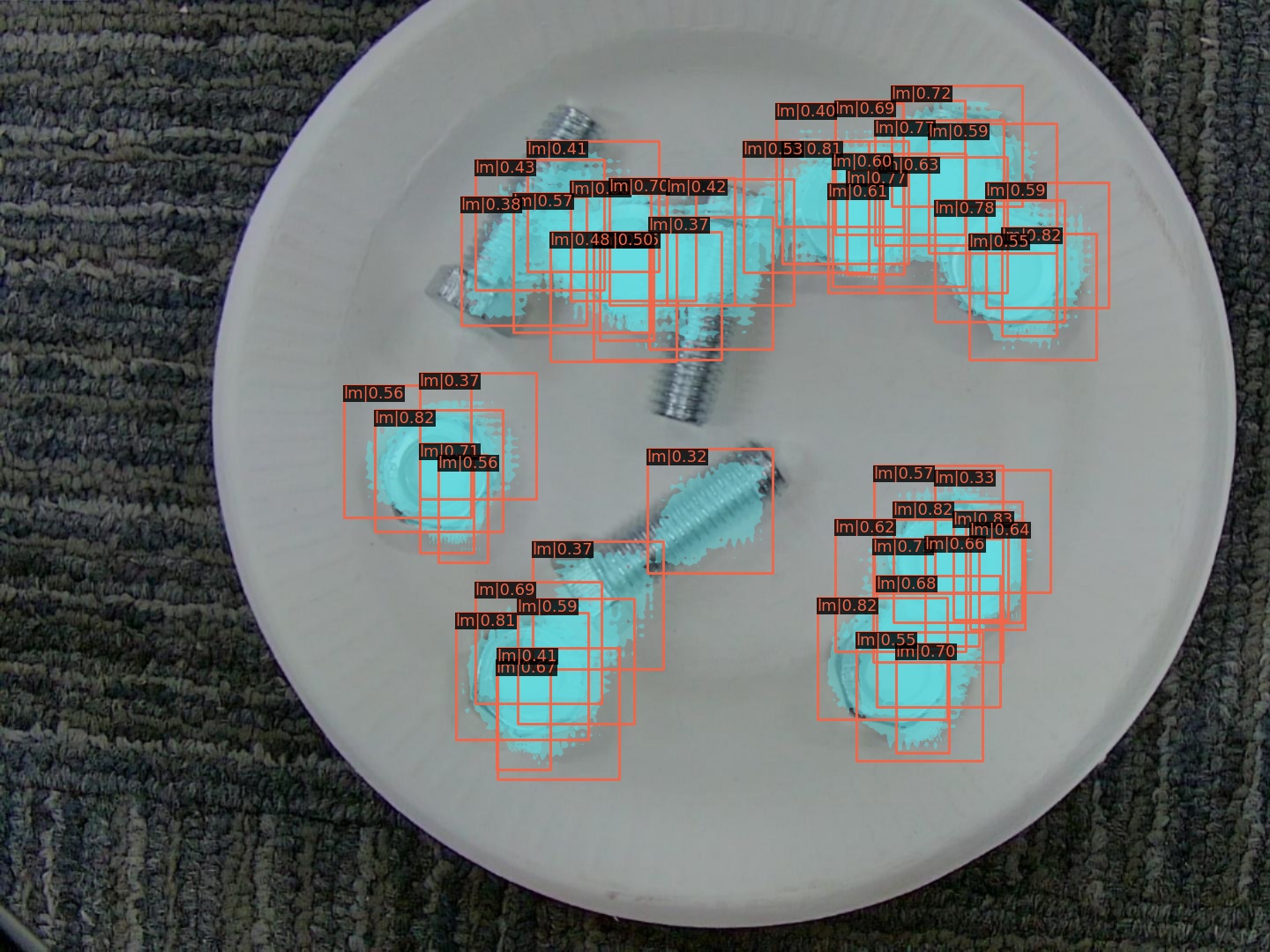 python tools/test.py work_dirs/mask_rcnn_r101_fpn_2x_coco/mask_rcnn_r101_fpn_2x_coco.py work_dirs/mask_rcnn_r101_fpn_2x_coco/latest.pth --show-dir work_dirs/mask_rcnn_r101_fpn_2x_coco/test_show我是一共有十张图片,7张图片用于训练,3张图片用于测试。有个缺点我没解决,就是螺母的中间,应该为背景,我在用labelme标注过程中都已经标注为_background_,训练的时候,我是用的num_classes=2,我再测试测试。