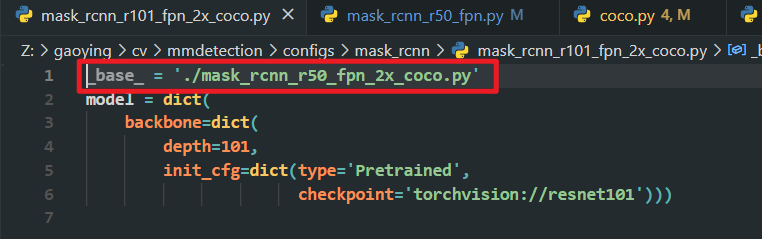configs/_base_/datasets/coco_instance_semantic.py2️⃣ 选择你要训练的模型对应的配置文件修改,假如我要训练的模型是mask_rcnn_r101_fpn_2x_coco.py,我打开configs/mask_rcnn/mask_rcnn_r101_fpn_2x_coco.py,内容如下: