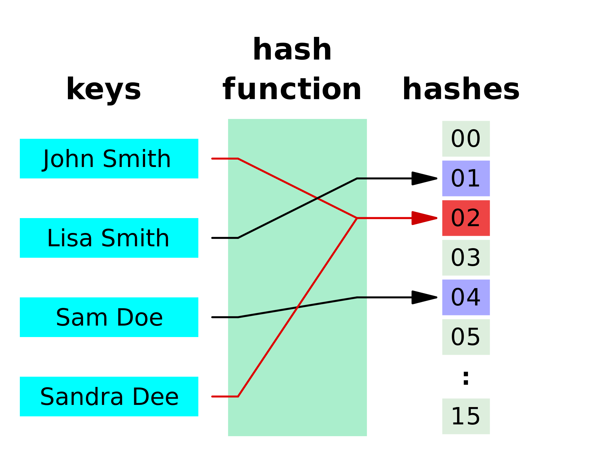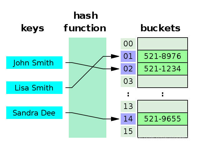 这里的hashcode就是哈希桶的索引,如何哈希函数H足够完美,那么每个key就会对应一个唯一的hashcode,但实际上往往会出现哈希冲突,即两个不同的key对应同一个hashcode,如下图所示,“John Smith” 和 “Sandra Dee” 经过哈希之后得到了相同的哈希值“02”。