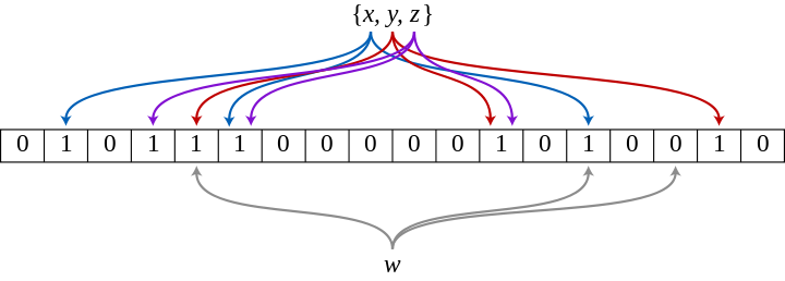 一个Bloom Filter是基于一个m位的位阵列(b1,…bm),这些位阵列的初始值为0。另外,还有一系列的hash函数(h1,…hk),这些hash函数的值域属于1~m。下图是一个bloom filter插入x,y,z并判断某个值w是否在该数据集的示意图: