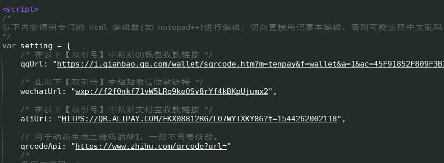 3、修改pay.html文件,将源码中QQ、微信、支付宝的收款码链接替换掉。