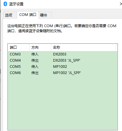 2、使用主机连接这个蓝牙设备,主机是win10系统。在系统中的蓝牙设置中,对这个设备的蓝牙连接,会出现两个虚拟端口。如下图,设备DX2003,会有COM3,COM4两个端口。如果进行数据传输,只能使用COM4端口。