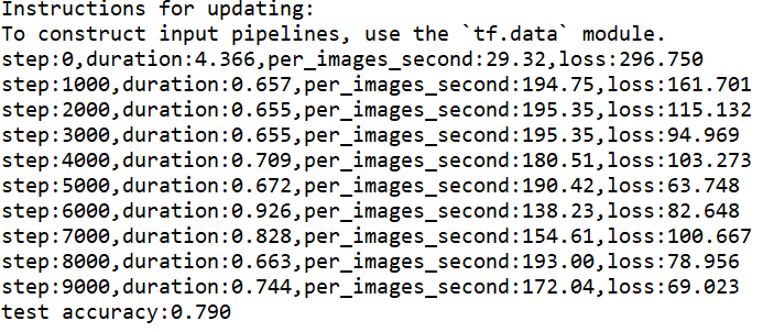 print("step:%d,duration:%.3f,per_images_second:%.2f,loss:%.3f"%(step,duration