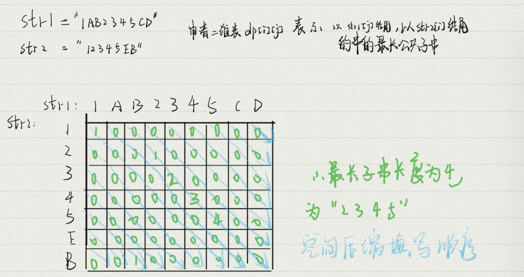 - 如果str2[i] == str1[j]则dp[i][j] = dp[i-1][j-1] + 1