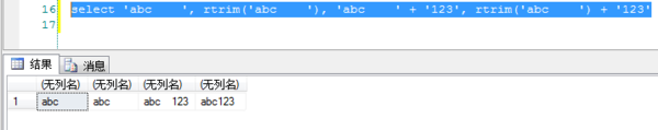 select 'abc ', rtrim('abc '), 'abc ' + '123', rtrim('abc ') + '123'返回的结果: