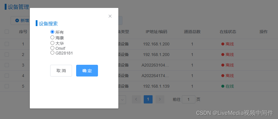 LiveMedia视频中间支持对局域网内海康、大华、ONVIF设备及已经注册的GB28181前端,进行自动搜索,添加,简化添加流程。