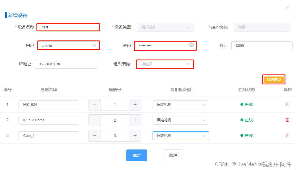 - 在设备添加页面,设置设备名称、用户名、密码及获取设备的通道信息后,保存即完成整个设备添加过程