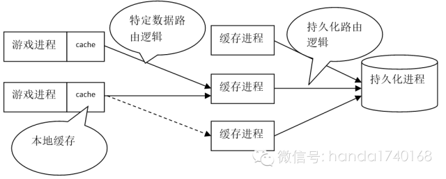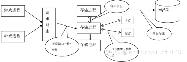 ◆首先我们要对数据的分布做规划,一般来说采用按玩家ID做分布,这样能让服务进程中内存的数据缓存高度命中。常用的手法有用一致性哈希来选择路由,调用相关的服务进程。