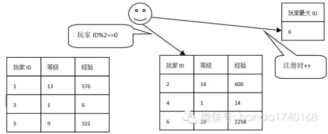 以玩家ID作为分表分库是一个非常自然的选择,但是这种方案,往往需要在逻辑代码中,对玩家数据按照自定义的规则,做存储进程的选择。但是如果发现这个分表分库的算法(原则)不符合需求,就需要把大量的数据做搬迁。如上图是按玩家ID做奇偶规则分布到两个表中,一旦需要增加第三台服务器,数据存储的目的服务器编号就变成了id%3,这样就需要把好多数据需要从原来的第一、二台数据库中拷贝出来,非常麻烦。