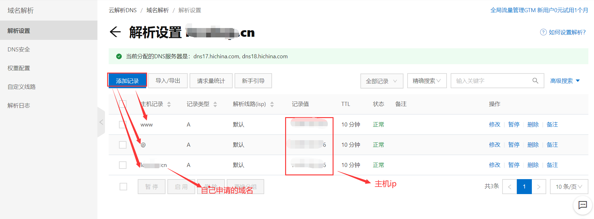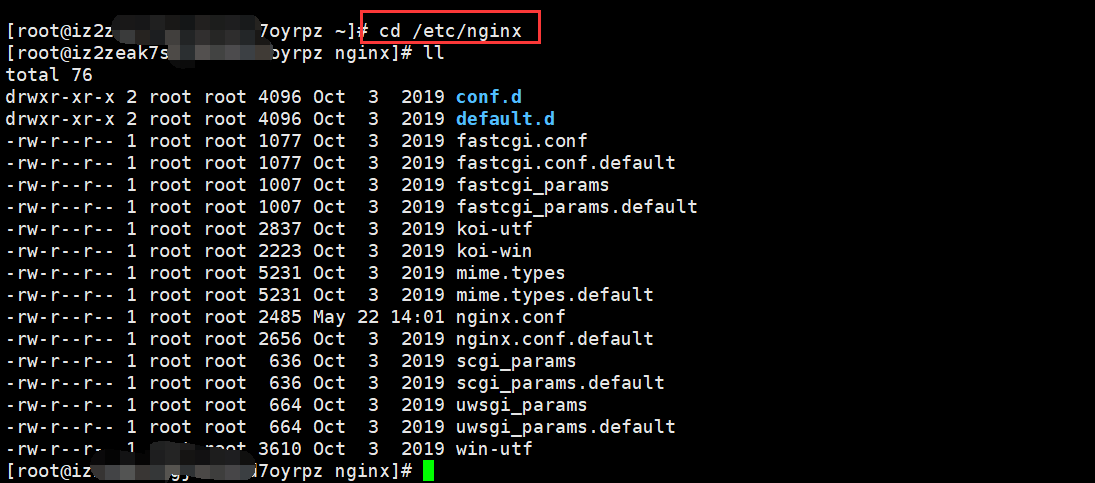 3.按照如上几张图的步骤进行操作,就完成了域名解析绑定主机ip了 接下来我们通过Nginx反向代理用域名来访问一下静态页面,首先安装Nginx 这里就不一一截图了 就说具体操作命令把 安装命令为:yum install nginx 这样默认安装即可 一般默认安装目录为 /etc/nginx 切换到Nginx的目录 命令:cd /etc/nginx 如下图:
