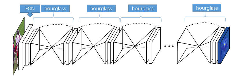 Hourglass采用了中间监督(Intermediate Supervision)。每个hourglass均会有热图(蓝色)。训练阶段,将这些热图和真实热图计算损失MSE,并求和,得到损失;推断阶段,使用的是最后一个hourglass的热图。