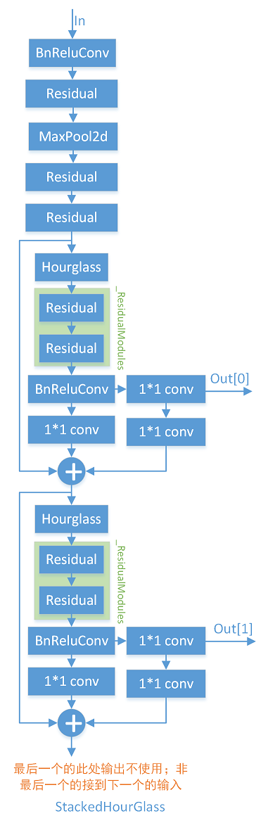 Hourglass如下图所示。其中每个方块均为下下图的残差模块。