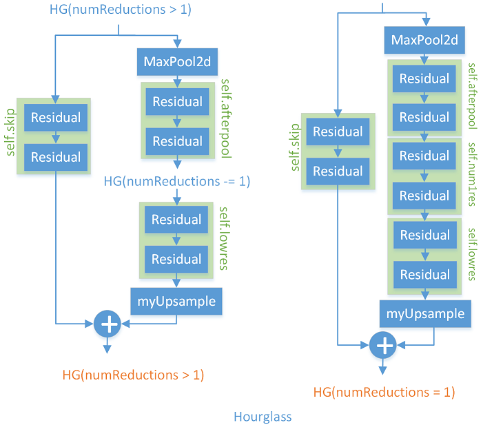 29 self.hg = Hourglass(self.nChannels, self.numReductions-1, self.nModules, self.poolKernel, self.poolStride) # 嵌套调用本身