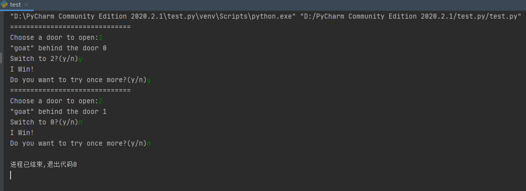 基本思路:使用字典来模拟3道门,使用键表示门的编号,值表示门后的物品。