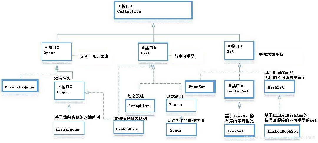 Map | key-value数据集合 | 无序 | key不能重复 | Hashtable,Directory,HashMap,TreeMap,LinkedHashMap |