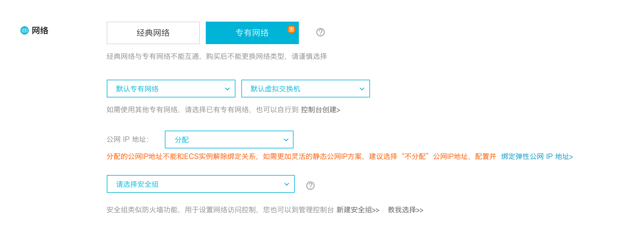 尽量以选择专有网络为先。