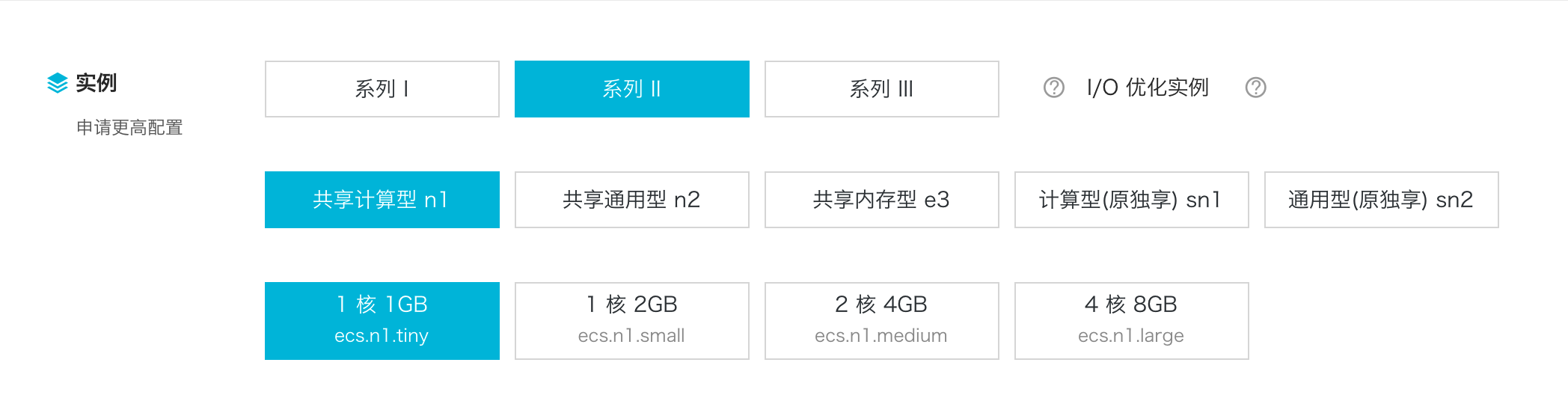 系列 III 相对系列 I 和系列 II 进行了硬件升级,采用 Intel Broadwell CPU、DDR4 内存,并默认为 I/O 优化实例,高主频和中主频两种 CPU 配合多种内存配比,可以提供给用户更好的性能以及更多的选择。