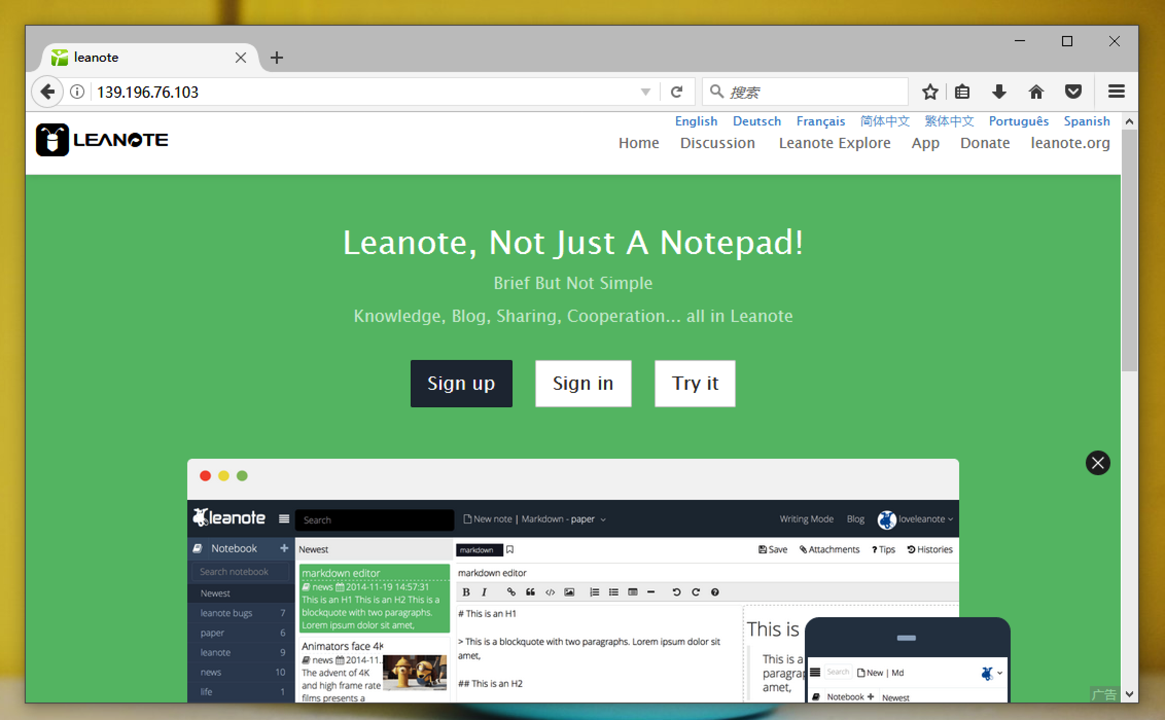 如果想试用我们的产品,欢迎在 https://leanote.com 上注册, Leanote团队为你提供稳定可靠的服务。 担心服务厂商如何处理你的个人数据吗?你可以下载Leanote安装在自己的服务器上,进行私有部署,笔记程序和笔记数据完全掌控在自己手里, 通过Leanote客户端连接与自建服务同步数据。