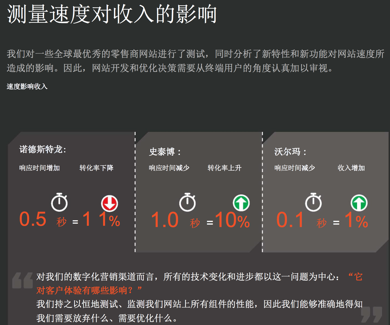 从图中可以看到,响应时间对转化率的影响非常大,比如沃尔玛够硬核了吧,沃尔玛的响应时间降低0.1秒,收入即可增加1%,是非常大的收入提升。