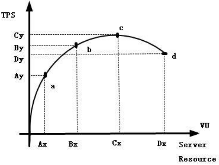 如下图所示,随着单位时间压力的不断增长,被测系统和服务器的压力不断增加,TPS会因为这些因素而发生变化,而且通常符合一下规律。