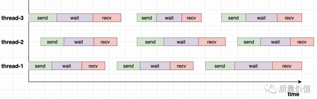 - 同一线程中连续的两个请求之间存在等待时间这种概念,即图中的空白处