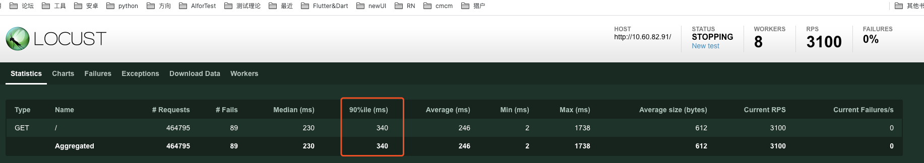 比如当Locust normal模式下,8进程,CPU瓶颈后,90%响应时间为340ms。同时wrk获取的响应时间为59.41ms.