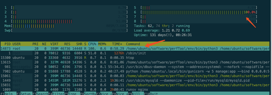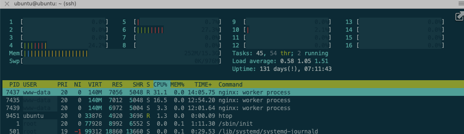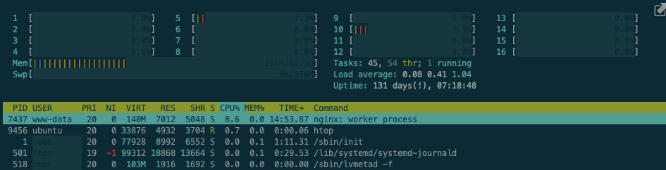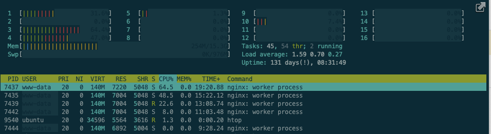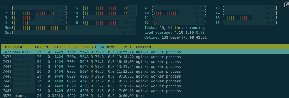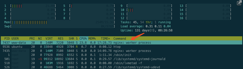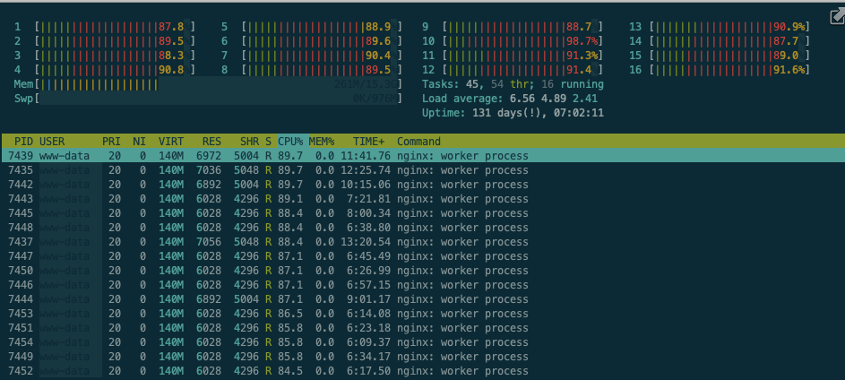 Nginx: 86% * 16 = 1376% , 达到CPU瓶颈