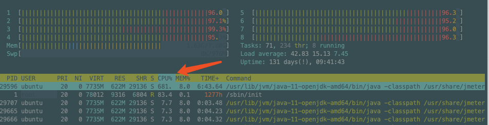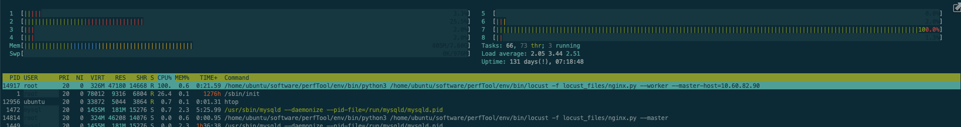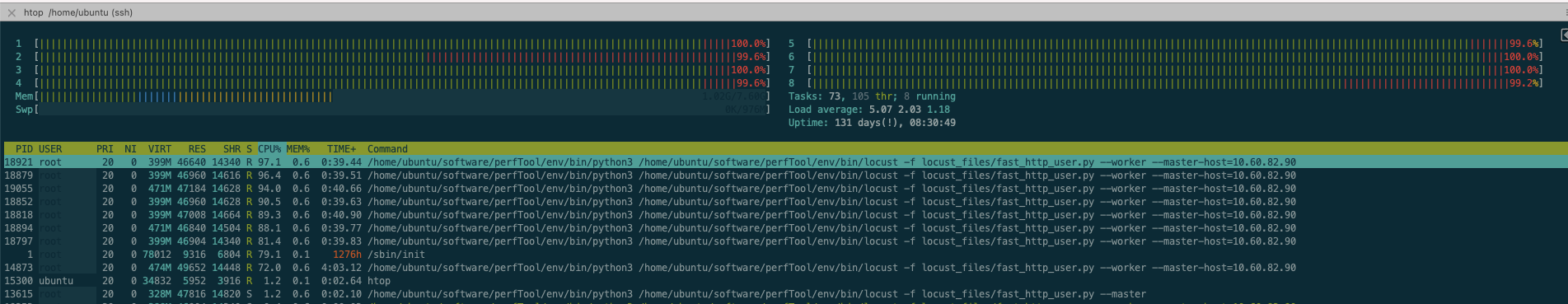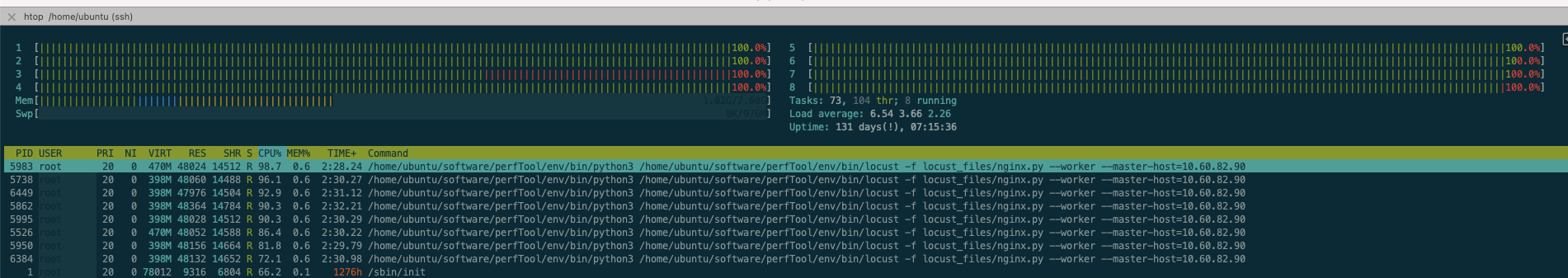 Locust: (CPU:100%, 单核CPU达到瓶颈)