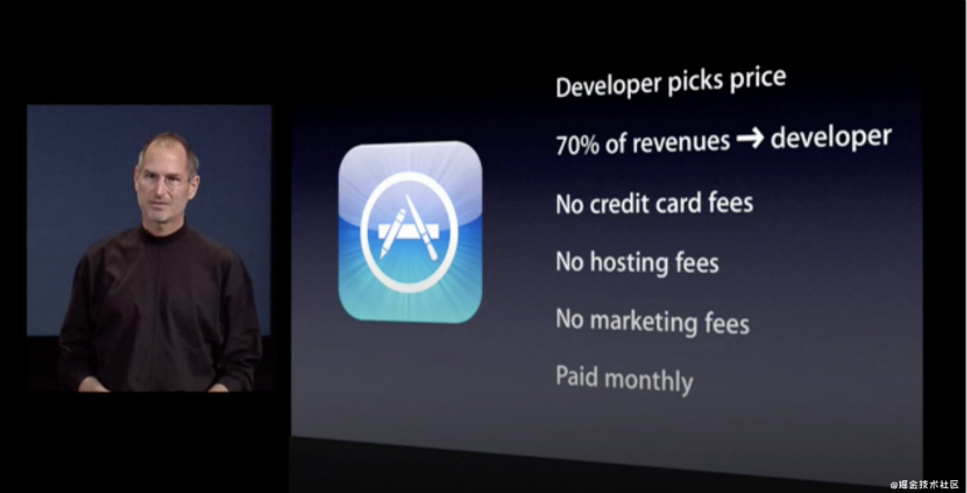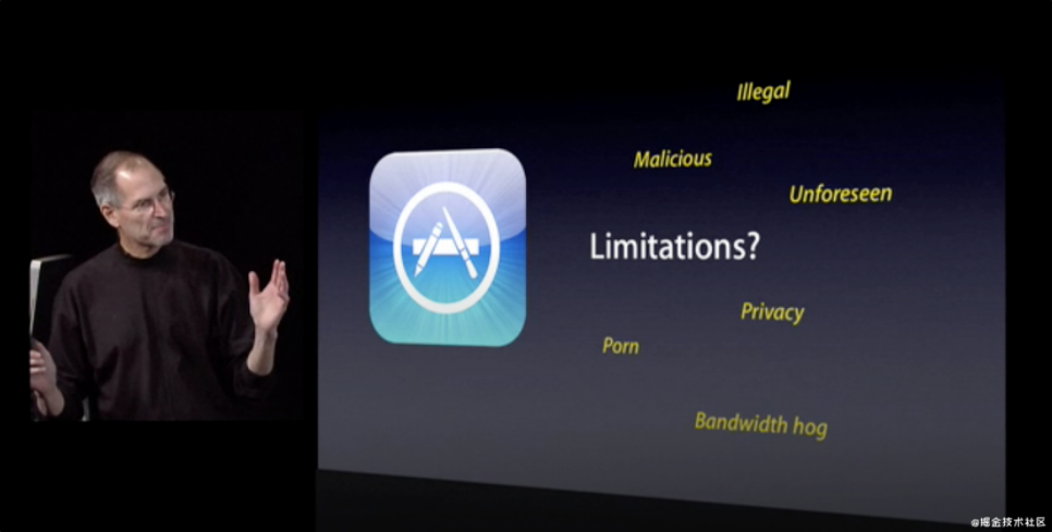 | 2008年3月6日 | 苹果发布会:iPhone 软件路线图(Apple March 6 Event: iPhone Software Roadmap) | 史蒂夫·乔布斯公布 iPhone 2.0 software:App Store,允许开发者为 iPhone 开发软件给用户。 | 乔布斯在发布会首次提出 “App Store”的概念,并指出 App Store 禁止非法、恶意、色情等应用。 |