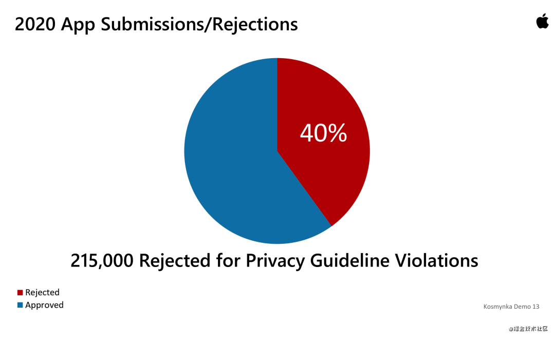 2020 年的拒率绝接近 40%,有 21.5 万款App因违反隐私政策而被拒,占 2020 年应用提交总数的40%。