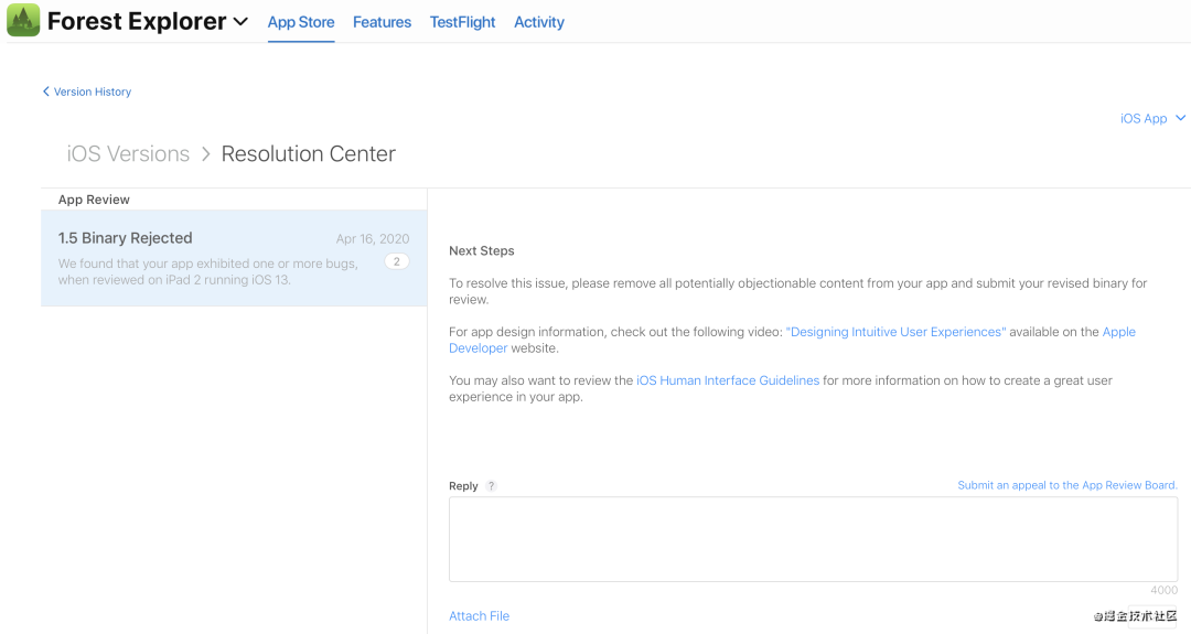 小编注:在苹果 App Store Connet 管理后台,被拒的应用,可以向 ERB 申诉,点击右下角的 Submit an appeal to the App Review Board 就可以啦。